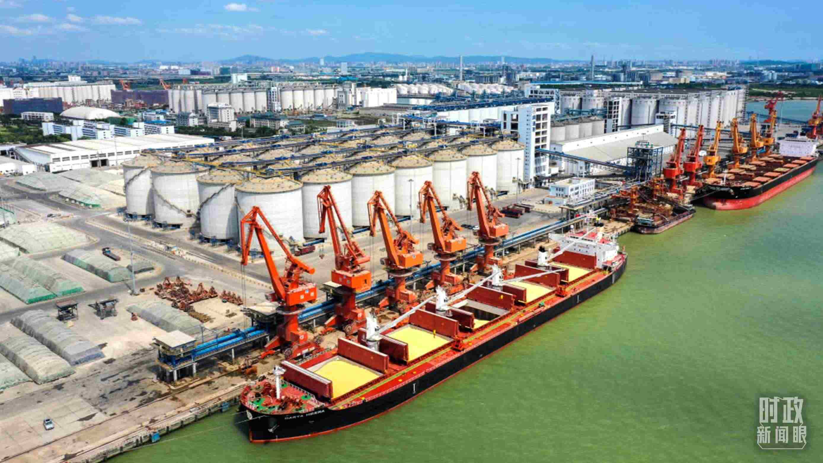 △從南非進(jìn)口的首船飼料玉米靠泊中國廣東麻涌港。(資料圖)