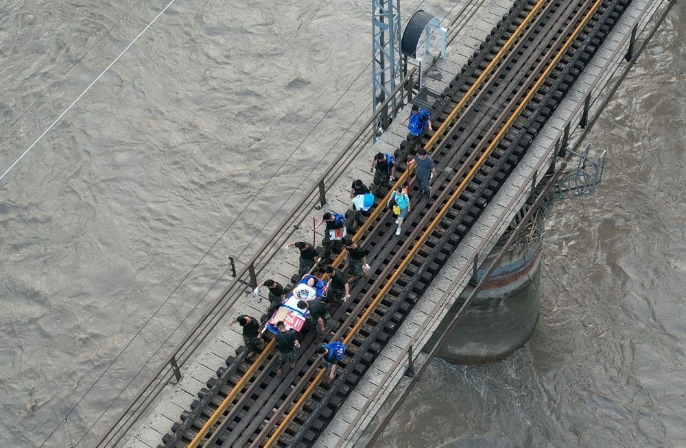 8月2日,受困列車旅客在救援人員的幫助下徒步趕往轉(zhuǎn)運(yùn)客車(無(wú)人機(jī)照片)。因北京豐臺(tái)至沙城鐵路(豐沙線)遭遇嚴(yán)重水害,搭乘K396次、Z180次、K1178次三趟列車的旅客滯留北京門(mén)頭溝山區(qū)。