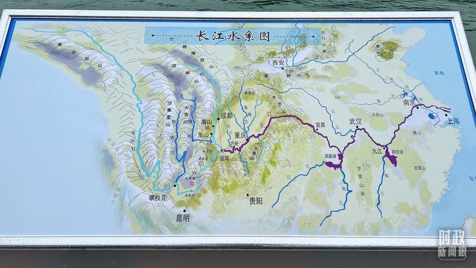 △2020年6月,習(xí)近平在四川宜賓三江口考察。圖為現(xiàn)場(chǎng)展出的《長江水系圖》。(總臺(tái)央視記者張宇拍攝)