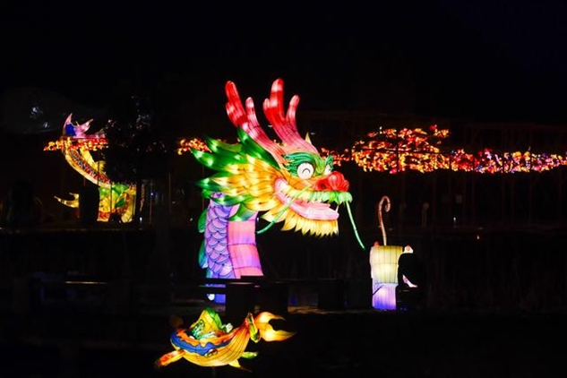 同樣迎來(lái)2024年龍年新春燈會(huì)的,還有湖北省恩施州宣恩縣城,這里的龍?jiān)煨蜔艚M格外亮眼,特別是其中一條非常壯觀的“貢水游龍”,龍身由30多只竹筏串聯(lián)而成,總長(zhǎng)度達(dá)到200多米。游客還可以登上龍船觀燈展、賞夜色。隨著金色的巨龍?jiān)诒趟序暄延蝿?dòng),也傳遞著吉祥的寓意。
