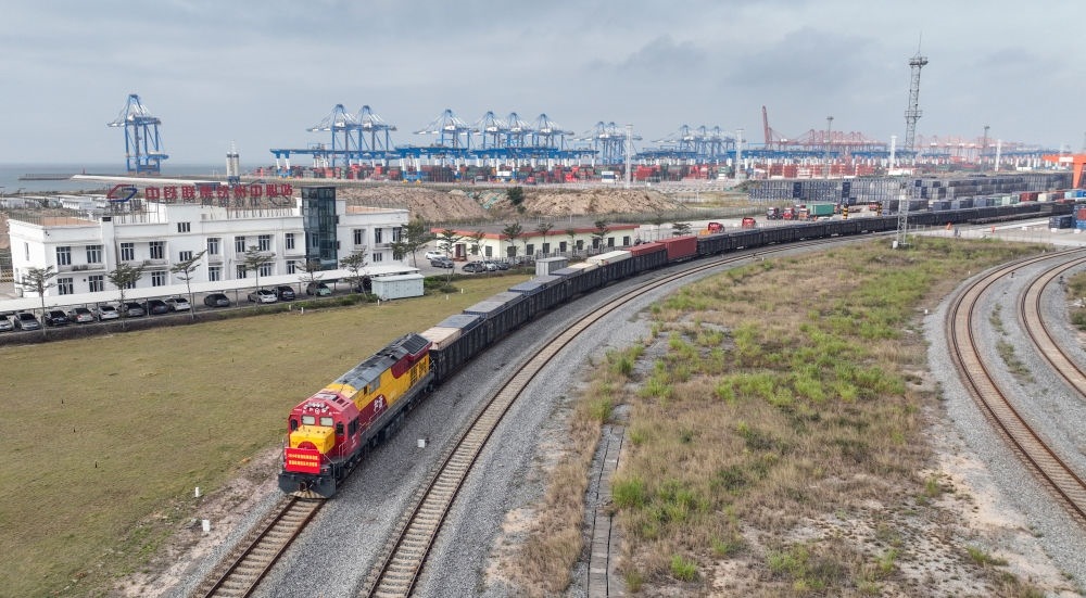 2024年1月19日,滿載東盟國家商品的年貨班列駛出廣西欽州港東站,開往重慶團(tuán)結(jié)村站和成都城廂站。
