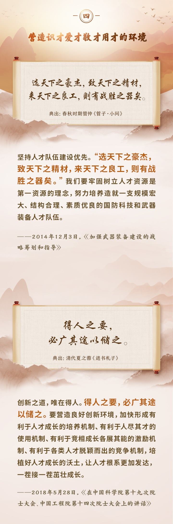 編者按:培養(yǎng)造就大批德才兼?zhèn)涞母咚刭|人才,是國家和民族長遠發(fā)展大計。黨的十八大以來,習近平總書記圍繞人才工作發(fā)表一系列重要論述,立意高遠,內(nèi)涵豐富,思想深刻,深刻回答了為什么建設人才強國、什么是人才強國、怎樣建設人才強國的重大理論和實踐問題。在這些重要論述中,總書記精妙運用古代典籍、經(jīng)典名句,以古喻今、啟迪思想、激蕩精神,讓我們一起來學習!