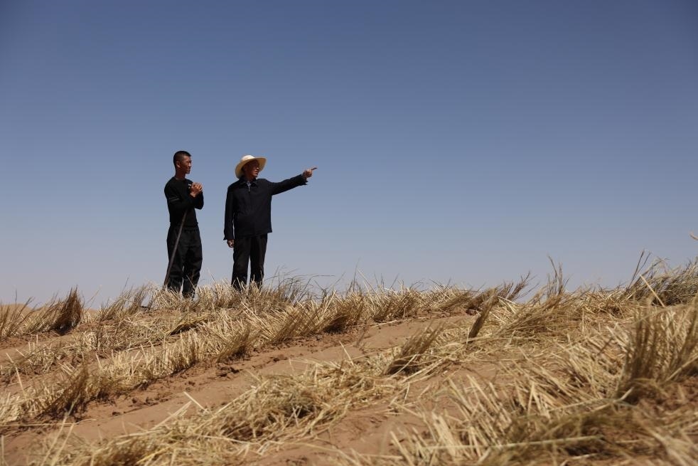 4月10日,在古浪縣八步沙林場(chǎng)麻黃塘沙區(qū),郭璽(左)和郭萬(wàn)剛在交流。新華社記者 方欣 攝