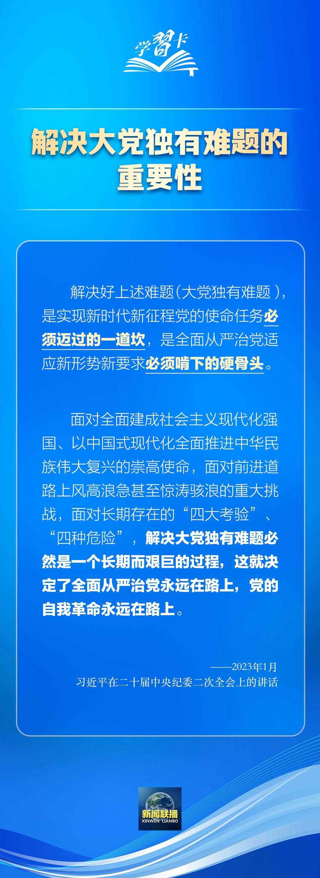 習近平總書記在不同場合多次強調(diào)全面從嚴治黨、黨的自我革命的重要性。解決好大黨獨有難題,是實現(xiàn)新時代新征程黨的使命任務必須邁過的一道坎,是全面從嚴治黨適應新形勢新要求必須啃下的硬骨頭。