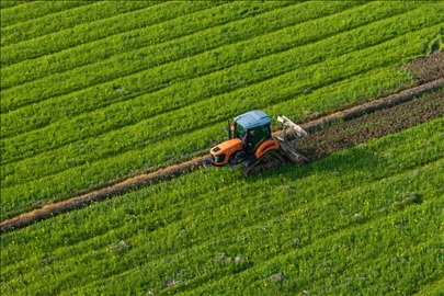 2024年3月19日,在湖南省常德市鼎城區(qū)謝家鋪鎮(zhèn)港中坪村,村民駕駛農(nóng)機翻耕田地(無人機照片)。新華社記者 陳思汗 攝