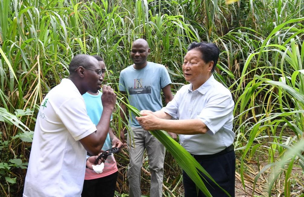 2021年8月12日,福建農(nóng)林大學(xué)國(guó)家菌草工程技術(shù)研究中心首席科學(xué)家林占熺(右一)在福建農(nóng)林大學(xué)菌草園讓尼日利亞留學(xué)生試嘗幼嫩菌草的味道。新華社記者 林善傳 攝