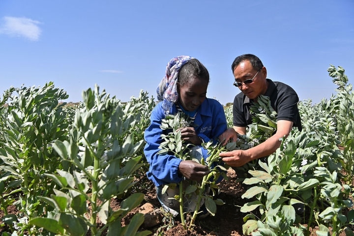 2023年9月27日,在位于厄立特里亞阿斯馬拉的農(nóng)業(yè)技術(shù)援助項目示范地,中國援厄第三期高級農(nóng)業(yè)專家組豆類作物專家劉運民(右)指導(dǎo)當(dāng)?shù)剞r(nóng)戶進行蠶豆作物的田間管理。新華社記者 韓旭 攝