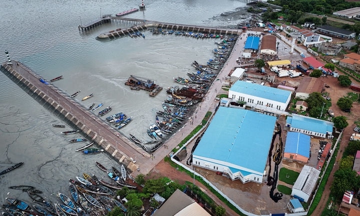 這是2024年7月8日在幾內(nèi)亞比紹首都比紹拍攝的板丁漁業(yè)碼頭和中企投建的水產(chǎn)品加工存儲綜合設(shè)施(右側(cè)藍頂建筑區(qū)域)(無人機照片)。新華社記者 韓旭 攝