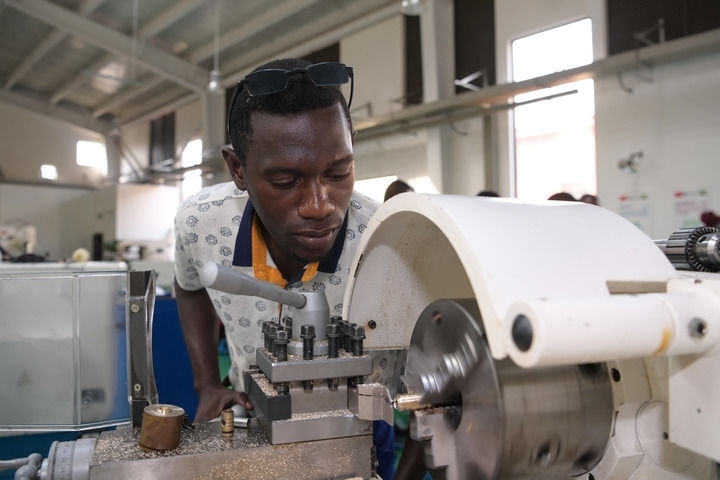 2023年1月10日,在加蓬首都利伯維爾的恩考克經(jīng)濟特區(qū),恩考克國際職業(yè)教育和培訓(xùn)中心(由中國航空技術(shù)國際控股有限公司聯(lián)合成都航空職業(yè)技術(shù)學(xué)院等院校共建)的學(xué)生進行車削加工操作訓(xùn)練。新華社記者 韓旭 攝