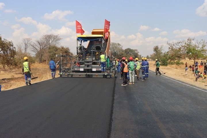 2024年8月27日,在馬拉維恩科塔科塔,施工人員在卡帕滕加至本加公路升級改造項目路段鋪筑瀝青路面。新華社發(fā)