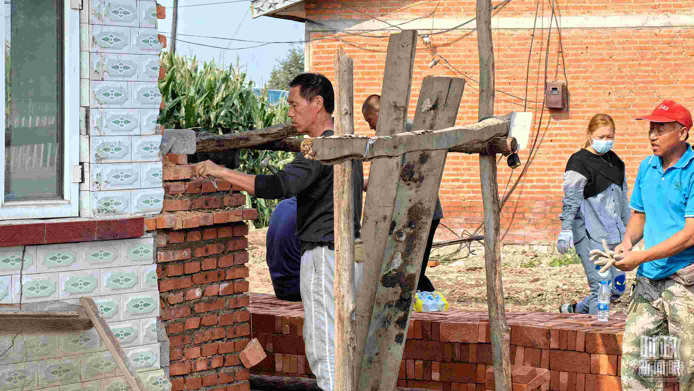 △2023年9月,黑龍江龍王廟村村民在修繕在洪水中受損的房屋。(總臺央廣記者潘毅拍攝)