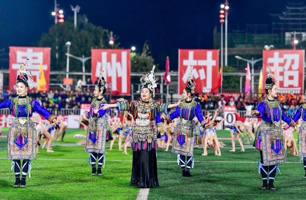 △2025年3月14日,2025年貴州“村超”40強(qiáng)交叉賽在榕江“村超”足球場(chǎng)舉行,演員在比賽間隙表演侗族大歌。