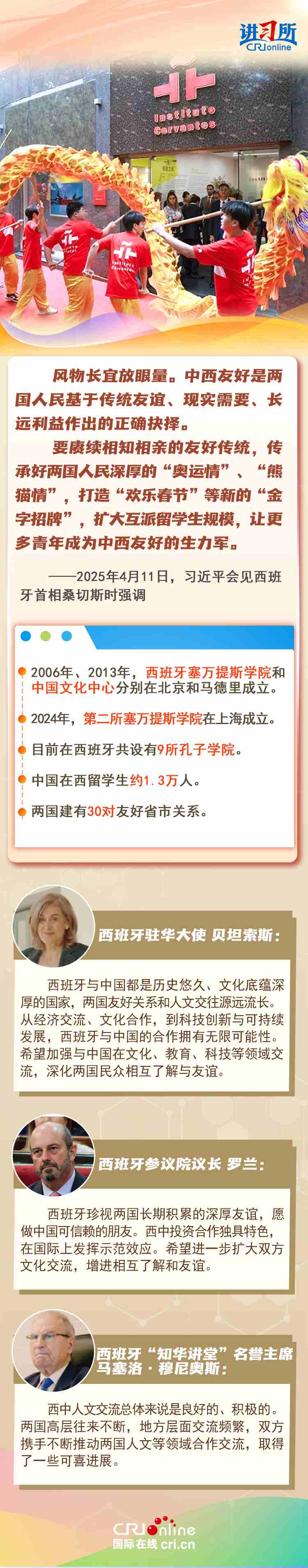 今年是中西全面戰(zhàn)略伙伴關(guān)系建立20周年,也是中歐建交50周年。多年來,中西兩國領(lǐng)導(dǎo)人保持密切互動(dòng),秉持互尊互信、互利共贏精神,兩國在深化貿(mào)易、投資、科技創(chuàng)新、綠色能源等領(lǐng)域取得豐富合作成果,雙邊關(guān)系走在中國同歐洲國家關(guān)系前列。在西班牙人士眼中,良好的對(duì)華關(guān)系對(duì)西班牙、歐洲和世界具有重要意義,將會(huì)為兩國人民帶來更多實(shí)實(shí)在在的福祉,也將共同創(chuàng)造更美好的未來。