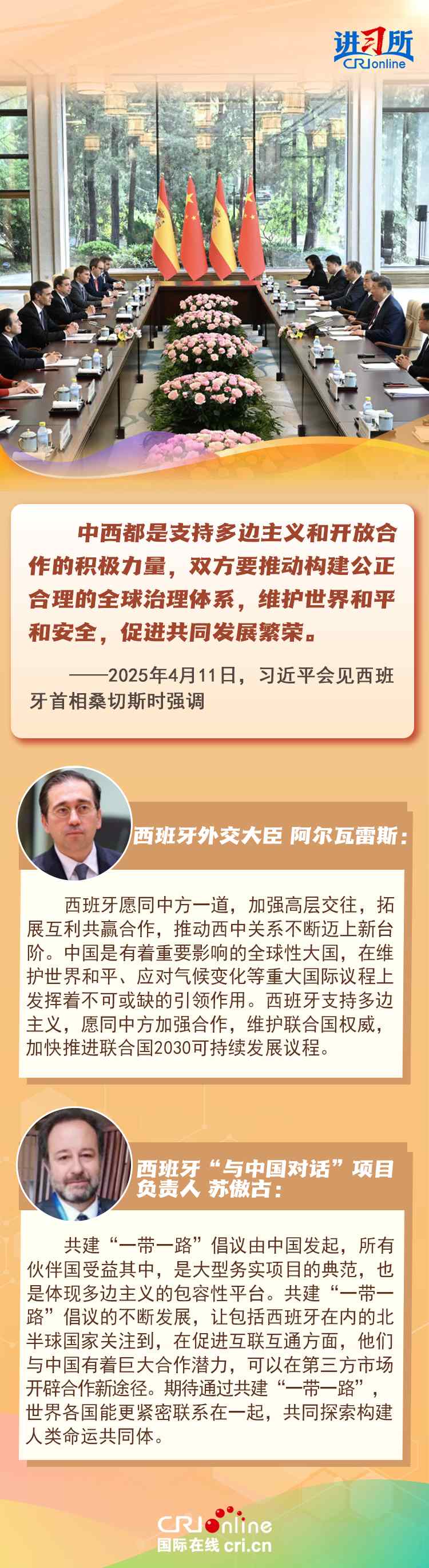 4月11日,中國國家主席習(xí)近平在北京會(huì)見來華訪問的西班牙首相桑切斯時(shí)表示,中西友好是兩國人民基于傳統(tǒng)友誼、現(xiàn)實(shí)需要、長遠(yuǎn)利益作出的正確抉擇,中西都是支持多邊主義和開放合作的積極力量,雙方要推動(dòng)構(gòu)建公正合理的全球治理體系,維護(hù)世界和平和安全,促進(jìn)共同發(fā)展繁榮。