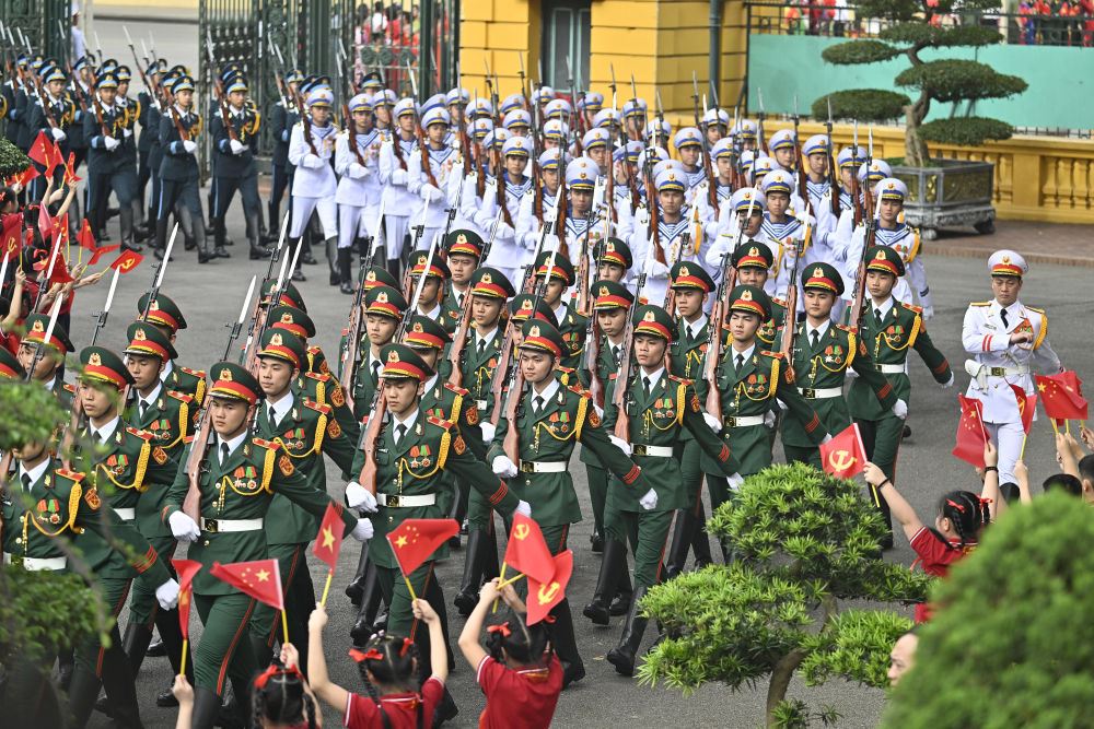當?shù)貢r間4月14日,中共中央總書記、國家主席習(xí)近平在河內(nèi)出席越共中央總書記蘇林舉行的歡迎儀式。
