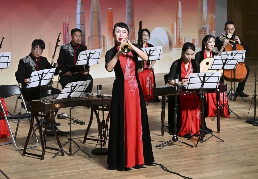2023年11月24日,在馬來西亞雪蘭莪州的廈門大學(xué)馬來西亞分校,藝術(shù)家在音樂會(huì)上演奏?!敖z路粵韻——廣東民族音樂會(huì)”當(dāng)晚在廈門大學(xué)馬來西亞分校舉辦。新華社記者程一恒攝
