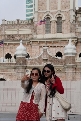 兩名來自中國云南的游客在馬來西亞首都吉隆坡地標(biāo)性歷史建筑蘇丹阿卜杜勒·薩馬德大廈前合影。人民日報(bào)記者 俞懿春攝