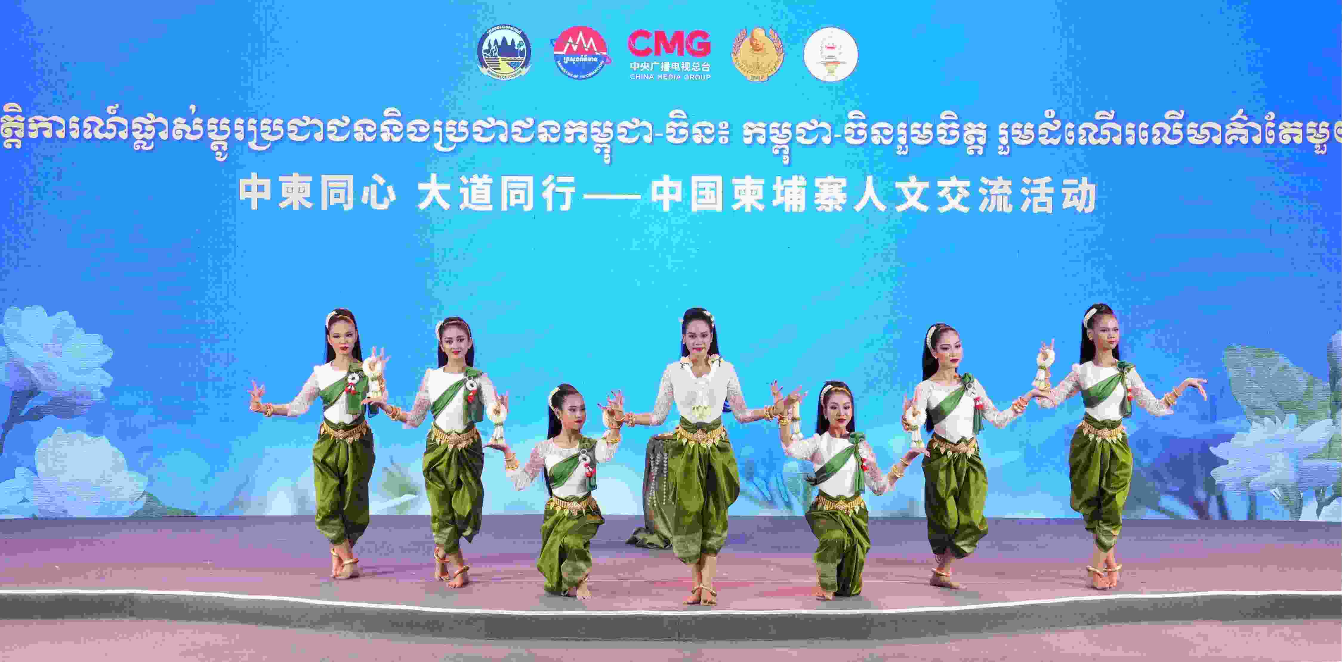 △2025年4月17日,“中柬同心 大道同行——中國(guó)柬埔寨人文交流活動(dòng)”現(xiàn)場(chǎng),來(lái)自柬埔寨帕花黛維公主舞蹈學(xué)校的師生代表在中國(guó)民歌《茉莉花》的旋律中表演柬埔寨傳統(tǒng)舞蹈。