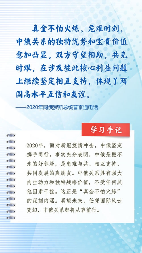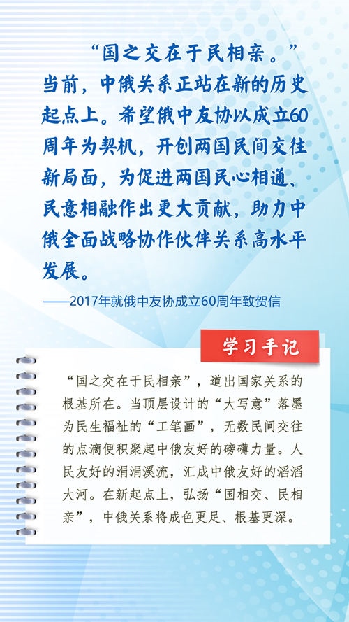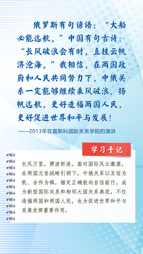 我們一起來學(xué)習(xí)品讀這些飽含哲思的論述,從中感悟新時(shí)代中俄關(guān)系在復(fù)雜的外部環(huán)境下堅(jiān)毅前行之道,感悟習(xí)近平主席作為大黨大國領(lǐng)袖、世界級(jí)領(lǐng)袖的時(shí)代擔(dān)當(dāng)與天下情懷。