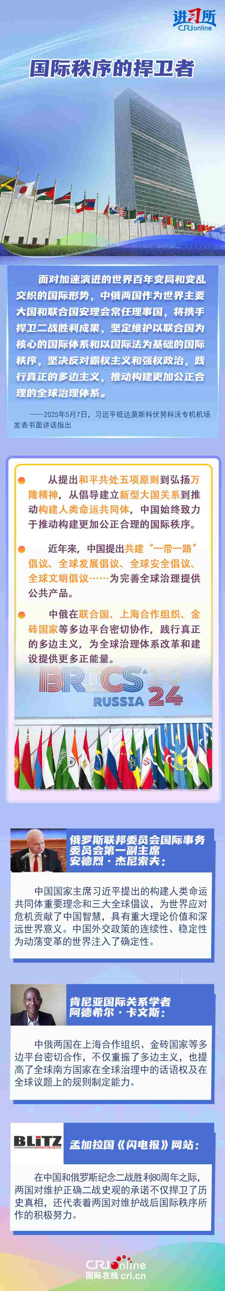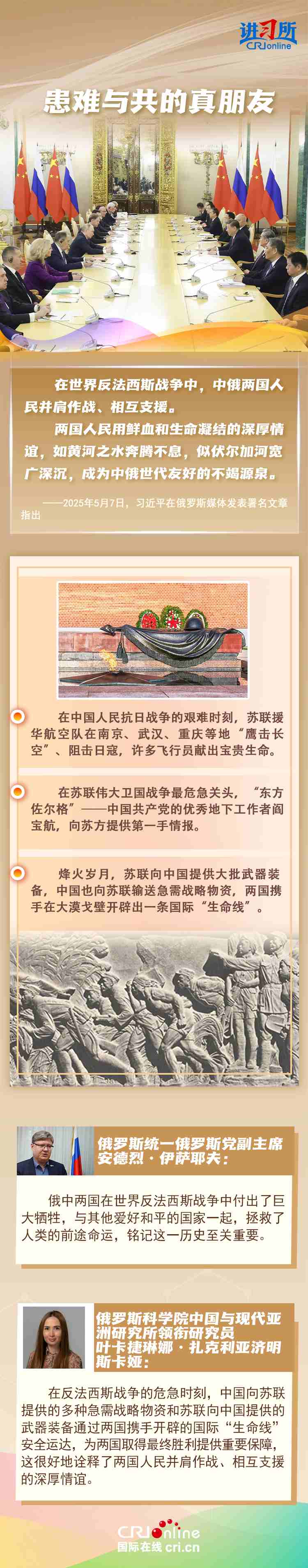 “兩國人民用鮮血和生命凝結(jié)的深厚情誼,如黃河之水奔騰不息,似伏爾加河寬廣深沉,成為中俄世代友好的不竭源泉。”今年是中國人民抗日戰(zhàn)爭、蘇聯(lián)偉大衛(wèi)國戰(zhàn)爭暨世界反法西斯戰(zhàn)爭勝利80周年,也是聯(lián)合國成立80周年。在這一重要歷史時間節(jié)點,習(xí)近平主席此訪不僅為中俄關(guān)系發(fā)展注入強勁動力,也向世界宣示中俄兩國攜手捍衛(wèi)二戰(zhàn)勝利成果的堅定意志。