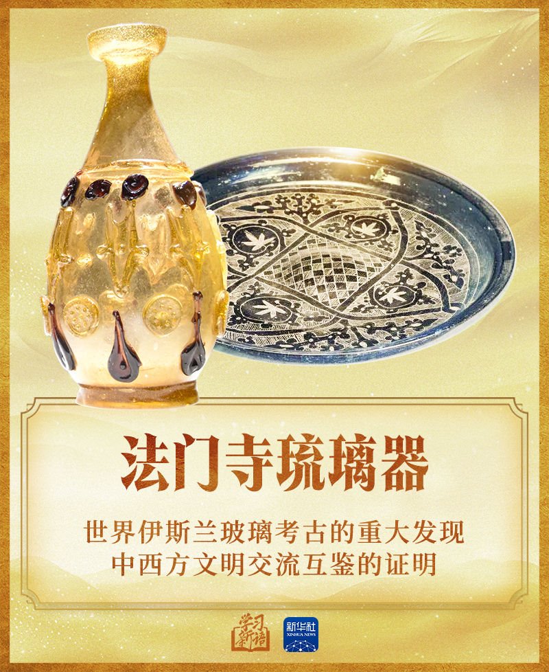 2014年3月,習(xí)近平主席在巴黎聯(lián)合國(guó)教科文組織總部發(fā)表演講時(shí),特別提到了1987年在陜西法門寺地宮中出土的20件精美的琉璃器,這是唐代傳入中國(guó)的東羅馬和伊斯蘭的琉璃器。他說:“我在欣賞這些域外文物時(shí),一直在思考一個(gè)問題,就是對(duì)待不同文明,不能只滿足于欣賞它們產(chǎn)生的精美物件,更應(yīng)該去領(lǐng)略其中包含的人文精神”。