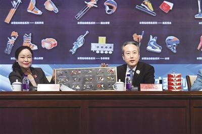 12月30日,北京冬奧組委召開市場開發(fā)、物流和注冊工作新聞發(fā)布會(huì)。圖為北京冬奧組委市場開發(fā)部部長樸學(xué)東(右)現(xiàn)場展示北京冬奧會(huì)特許商品。 新京報(bào)記者 陶冉 攝