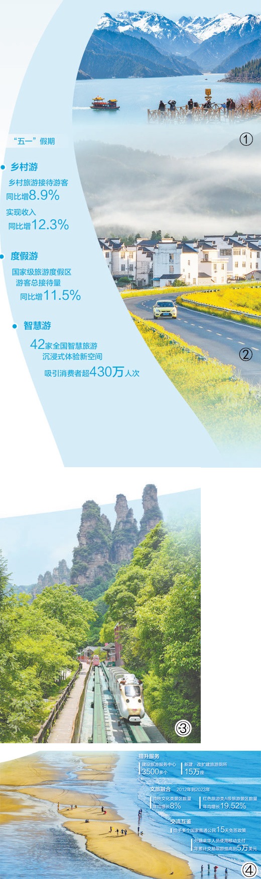 圖①:新疆天池景區(qū)。張 昀攝(影像中國(guó)) 圖②:安徽黃山休寧縣鄉(xiāng)村風(fēng)光。施亞磊攝(影像中國(guó))圖③:湖南張家界國(guó)家森林公園。吳勇兵攝(影像中國(guó)) 圖④:海南萬(wàn)寧石梅灣。劉國(guó)興攝(影像中國(guó))數(shù)據(jù)來(lái)源:文化和旅游部等