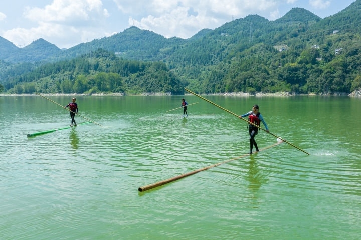 2023年9月15日,愛好者在湖北宣恩雙龍湖上練習“獨竹漂”(無人機照片)。新華社發(fā)(王法鈞攝)