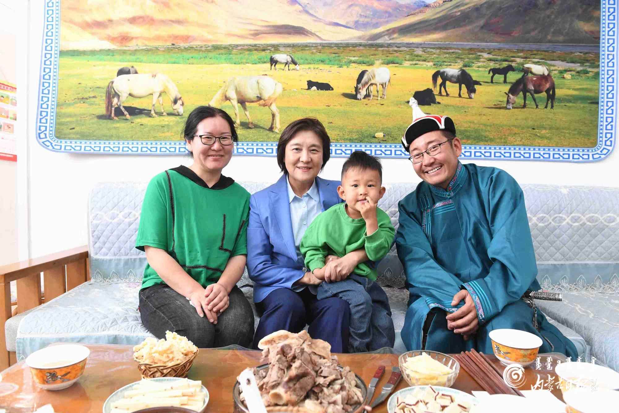 6月8日,自治區(qū)黨委副書(shū)記、自治區(qū)主席布小林在巴彥淖爾市烏拉特中旗調(diào)研,她來(lái)到希日朝魯嘎查牧戶(hù)呼斯勒家走訪(fǎng),并與他們一家合影留念。內(nèi)蒙古日?qǐng)?bào)社融媒體記者 韓卿立攝
