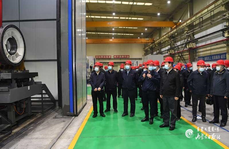 4月21日,自治區(qū)黨委書記、人大常委會(huì)主任石泰峰,與參加自治區(qū)推動(dòng)高質(zhì)量發(fā)展重大項(xiàng)目建設(shè)動(dòng)員大會(huì)的代表一起觀摩南高齒(包頭)傳動(dòng)設(shè)備有限公司風(fēng)電齒輪箱二期擴(kuò)建項(xiàng)目。內(nèi)蒙古日?qǐng)?bào)社融媒體記者 袁永紅 攝
