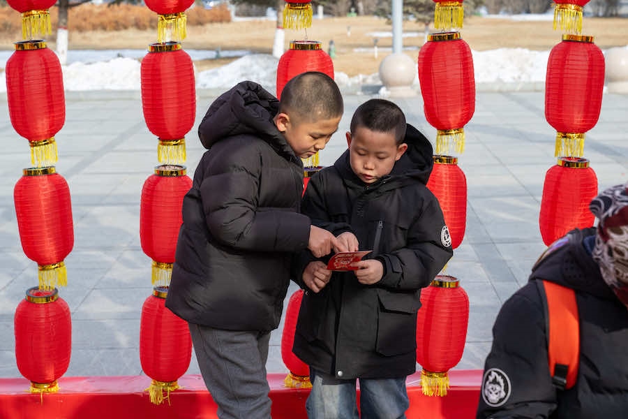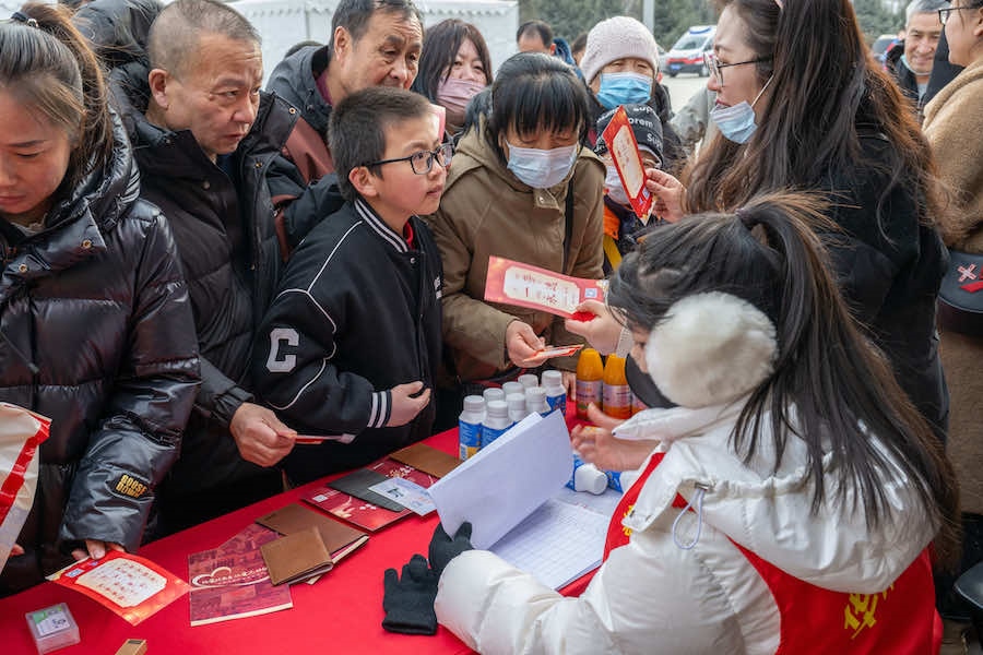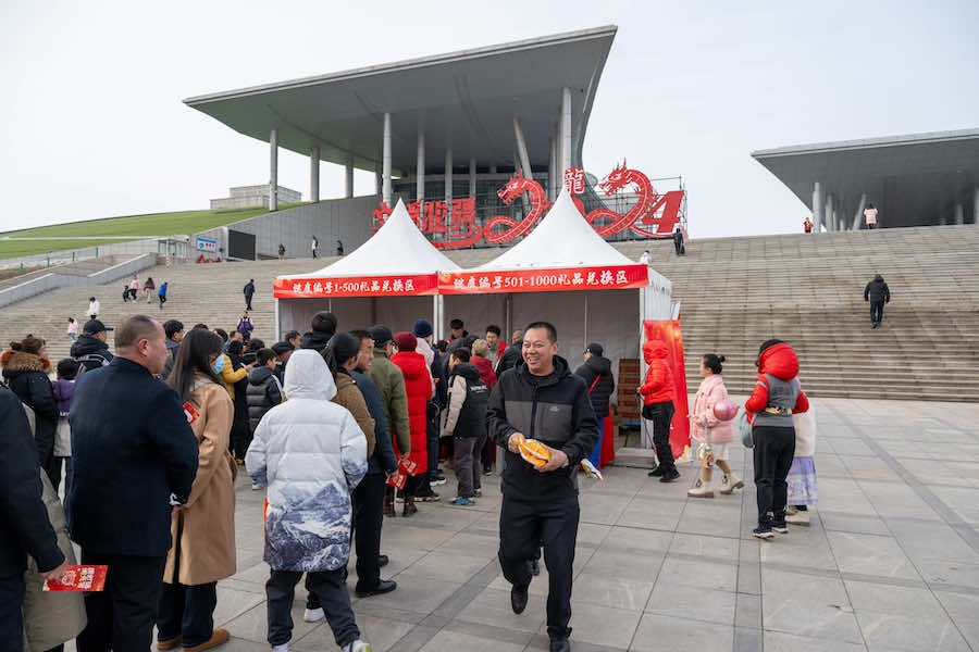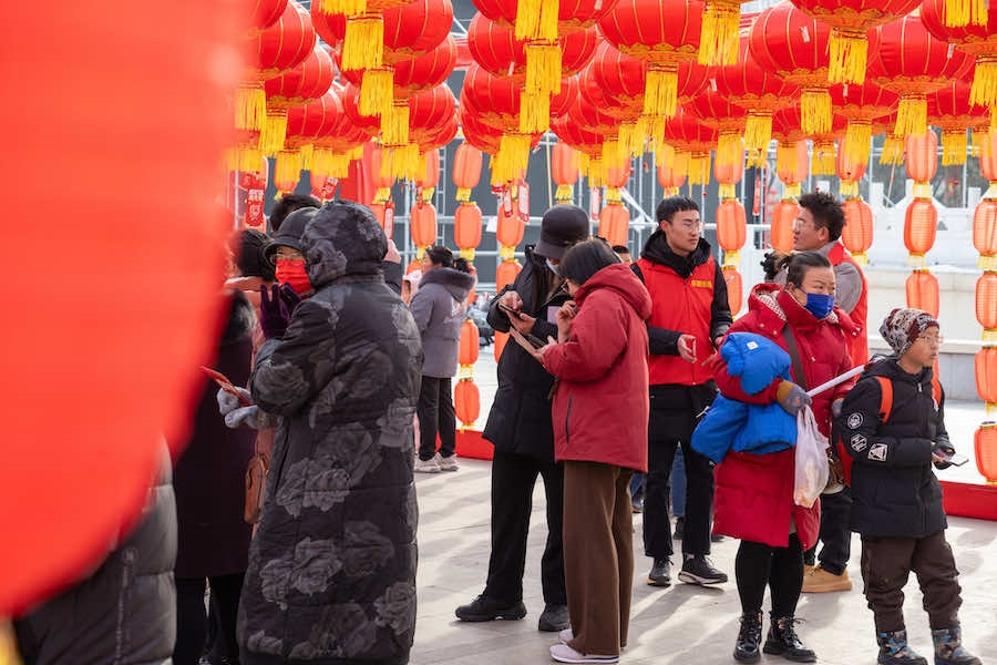 2月23日下午,在內(nèi)蒙古呼和浩特寶鼎廣場,市民游客拿著燈謎卡來到禮品兌換區(qū),興奮不已地排隊(duì)等待著。