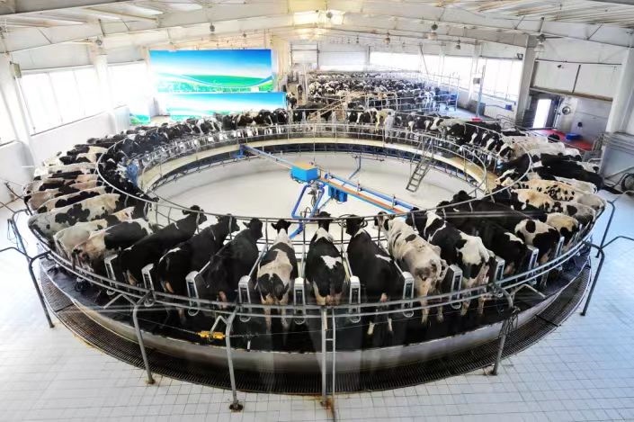 伊利牧場(chǎng)轉(zhuǎn)盤式擠奶現(xiàn)場(chǎng)。