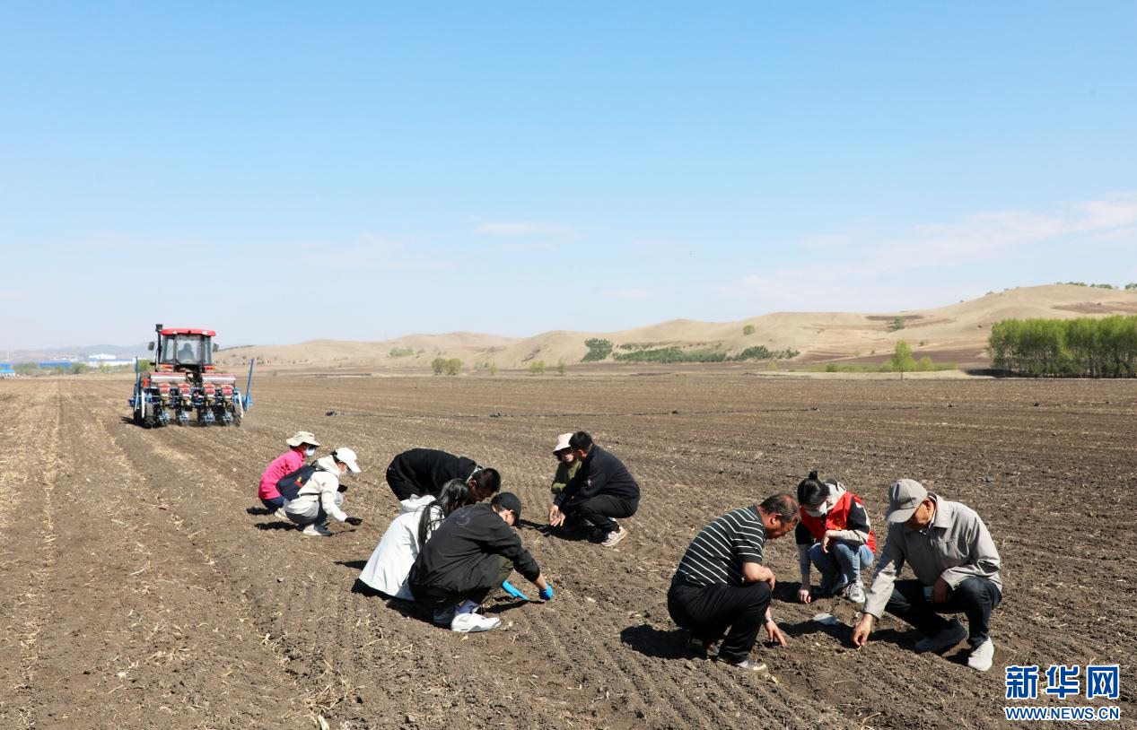 ??5月7日,在內蒙古自治區(qū)扎蘭屯大豆科技小院,內蒙古農業(yè)大學研究生在大河灣鎮(zhèn)尖山子村試驗田播種大豆。新華網(wǎng)發(fā)(韓冷 攝)