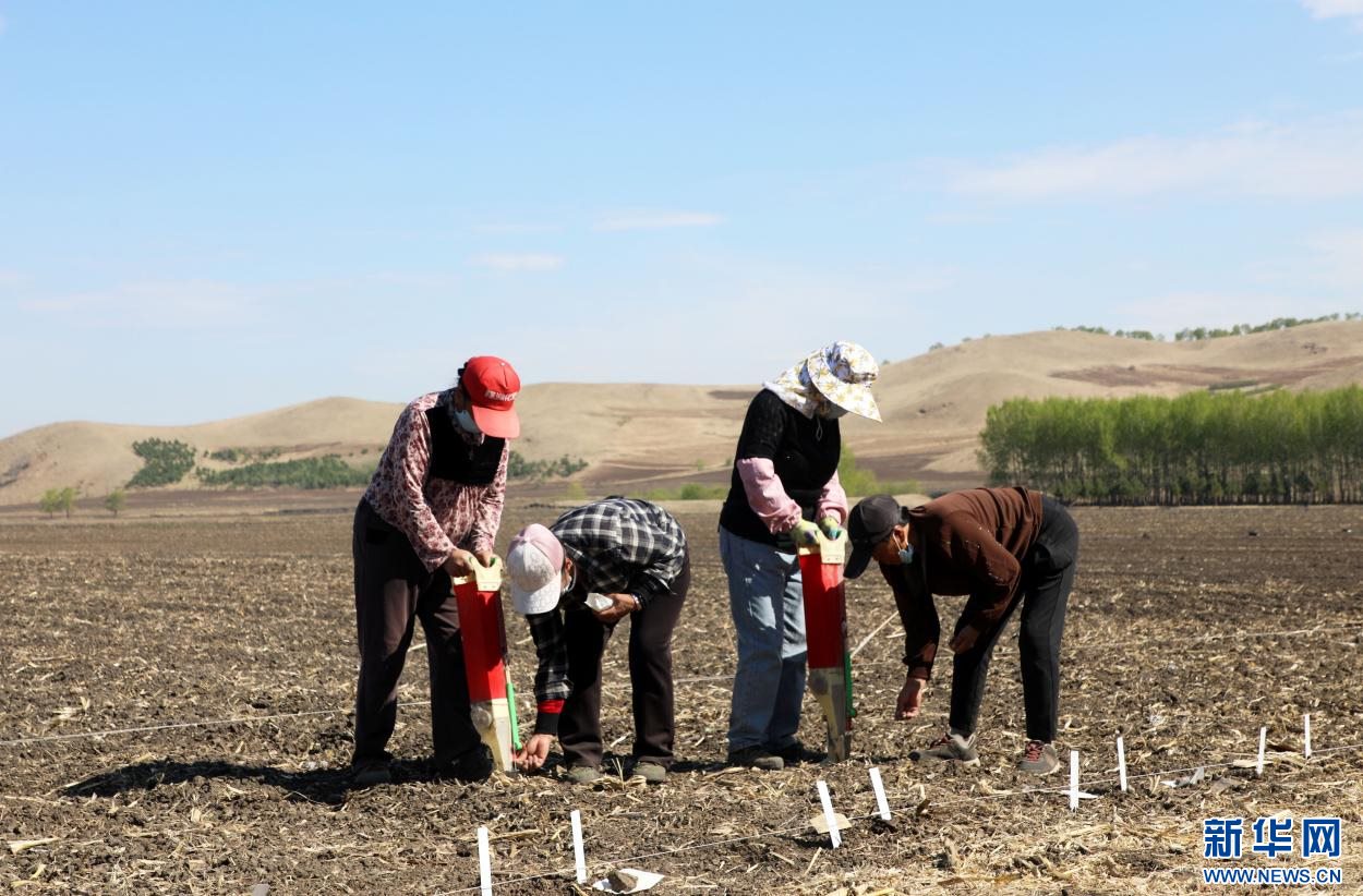 ?5月7日,在內蒙古扎蘭屯大豆科技小院,農民在大河灣鎮(zhèn)尖山子村試驗田手工播種大豆。新華網(wǎng)發(fā) (韓冷 攝)