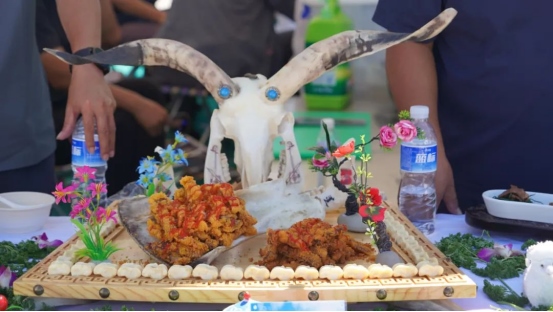 烤全羊、手抓肉、肚包肉……活動(dòng)現(xiàn)場(chǎng),參賽選手們各顯神通,用他們精湛的廚藝為大家呈現(xiàn)了一場(chǎng)全羊盛宴。來(lái)自不同地區(qū)的36道羊肉系列菜,現(xiàn)場(chǎng)烹飪制作并供嘉賓、游客品嘗,評(píng)委從每道菜品的食材、烹飪方法、口味色澤、擺盤設(shè)計(jì)等方面入手,進(jìn)行現(xiàn)場(chǎng)打分排名。一道道精心烹飪的美食香飄四座,激發(fā)了現(xiàn)場(chǎng)觀眾的食欲。大家紛紛圍上前來(lái),爭(zhēng)相品嘗?!把蛉膺€有這么多的做法,真是讓人大開(kāi)眼界?!薄疤贸粤?,羊肉都很鮮美!”現(xiàn)場(chǎng)游客無(wú)一不發(fā)出贊嘆?!?/p>