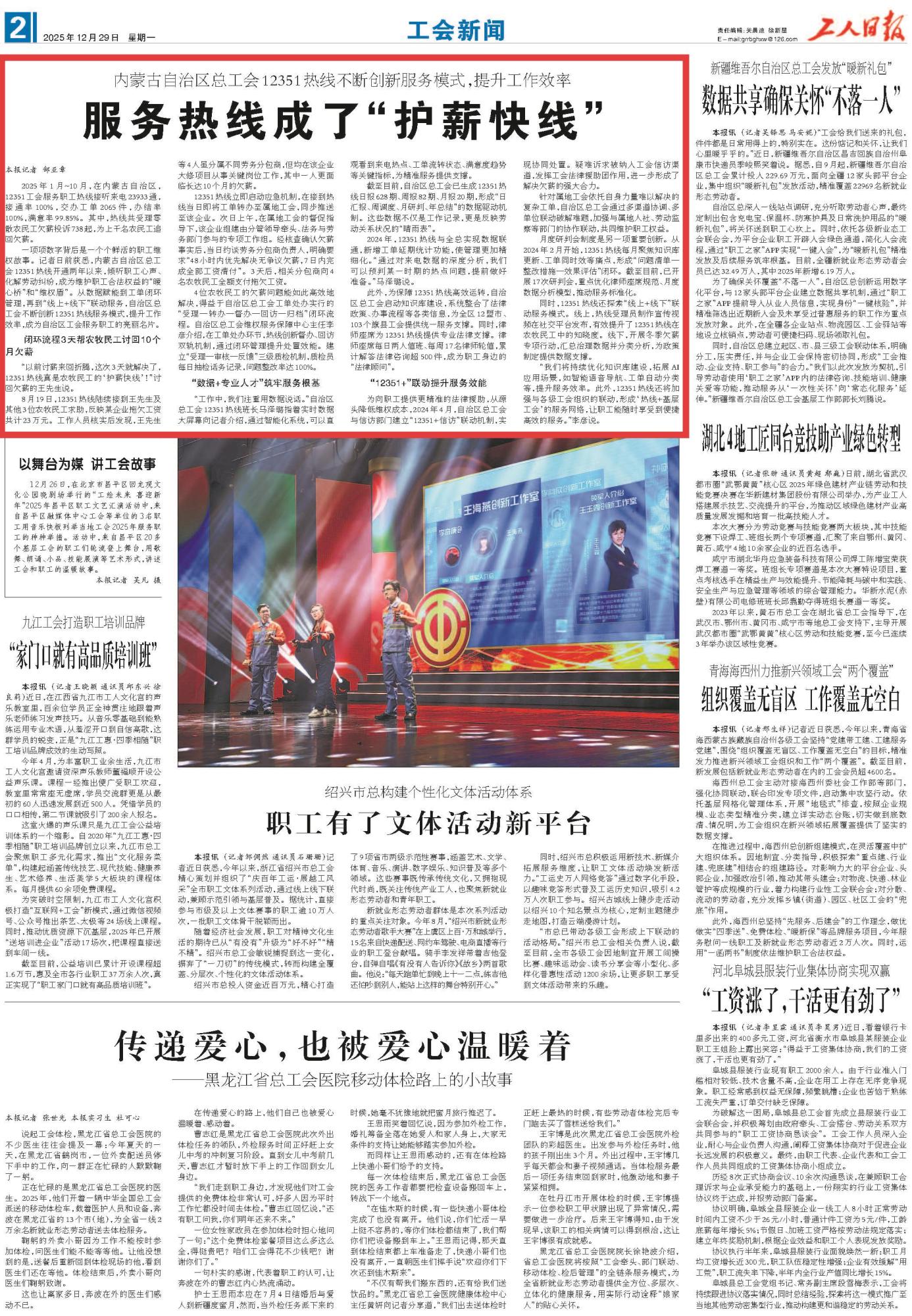 2025年12月29日,《工人日?qǐng)?bào)》第2版刊發(fā)題為《服務(wù)熱線成了“護(hù)薪快線”》的文章,報(bào)道了內(nèi)蒙古自治區(qū)總工會(huì)12351熱線開通兩年以來(lái),傾聽職工心聲、化解勞動(dòng)糾紛,成為維護(hù)職工合法權(quán)益的“暖心橋”和“維權(quán)盾”。其中,熱線共受理零散農(nóng)民工欠薪投訴738起,為上千名農(nóng)民工追回欠薪。