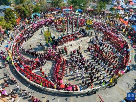 3月2日,當?shù)厝罕娕c來自各地的游客踩著相同的鼓點進場舞蹈(無人機照片)。