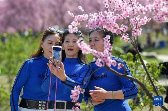 3月8日,游人在都江堰市青城山鎮(zhèn)“問花村”自拍。