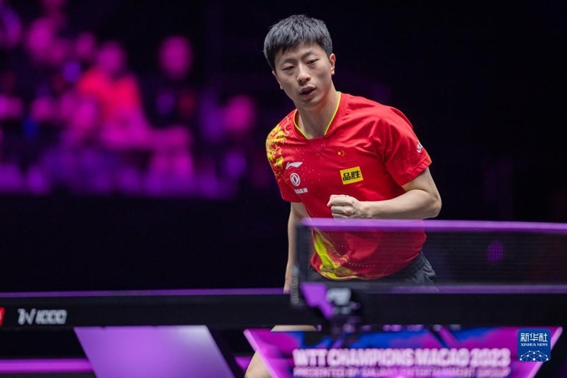 2023年4月22日,馬龍?jiān)诒荣愔小.?dāng)日,在澳門塔石體育館舉行的2023世界乒乓球職業(yè)大聯(lián)盟(WTT)澳門冠軍賽男子單打半決賽中,中國(guó)選手馬龍以4比1戰(zhàn)勝法國(guó)選手艾利克斯·勒布倫,晉級(jí)決賽。新華社記者 張金加攝