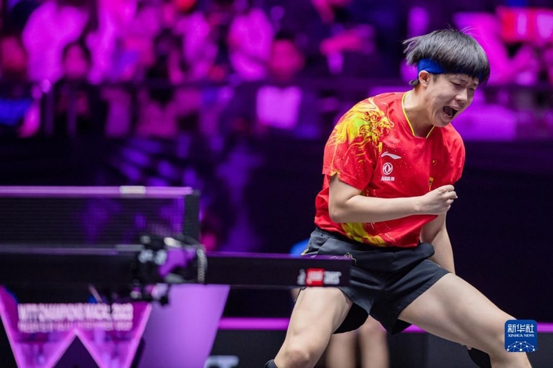 2023年4月23日,王曼昱在比賽中慶祝得分。當(dāng)日,在澳門塔石體育館舉行的2023世界乒乓球職業(yè)大聯(lián)盟(WTT)澳門冠軍賽女子單打決賽中,中國(guó)選手王曼昱以4比2戰(zhàn)勝隊(duì)友陳夢(mèng),奪得冠軍。新華社記者 張金加攝