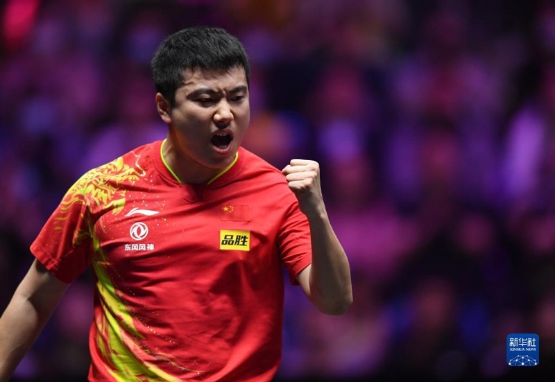 2023年4月23日,中國(guó)選手王楚欽慶祝得分。當(dāng)日,在澳門塔石體育館舉行的2023世界乒乓球職業(yè)大聯(lián)盟(WTT)澳門冠軍賽男子單打決賽中,中國(guó)選手王楚欽以4比0戰(zhàn)勝隊(duì)友馬龍,奪得冠軍。新華社記者 張金加攝