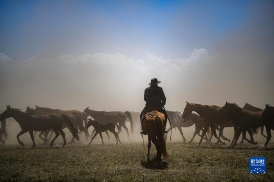 7月16日,牧民在昭蘇縣天馬旅游文化園的草原上遛馬。