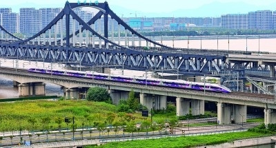 10月3日,亞運涂裝復興號智能動車組從杭州東站發(fā)出,穿過錢塘江。本報記者 陳城攝/光明圖片