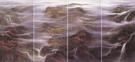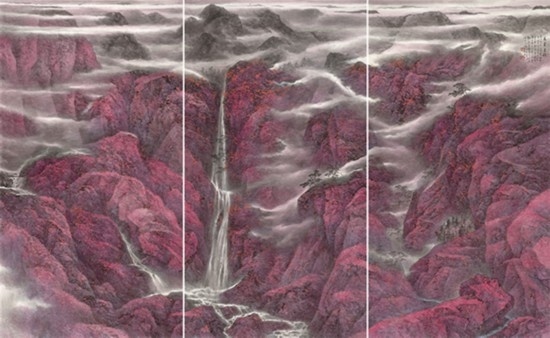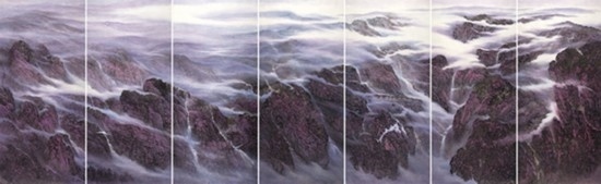 且看樂震文的《直上浮云》《云卷云舒》和《黃土馳風,日月星辰》,那逶迤茫茫的群山峻嶺,那縱橫畫面的云蒸霞蔚,那連綿不絕的箭樓城堞,哪里還是傳統文人山水畫的淡煙輕嵐,縹緲冷逸?濃縮于畫內的精神意蘊,分明凸顯了現代山水畫對家國情懷的抒發(fā)。且讀張弛的《云起疊嶂》《惟余莽莽》和《紫氣氤氳》,那天光紫氣的浩渺煙云,那渾然一體的山水氣象,那千回百轉的流水飛泉,其實早已脫離了對自然山水的寫照,而是她感悟的時代精神在偌大畫面上的縱橫揮寫、主觀臆造。