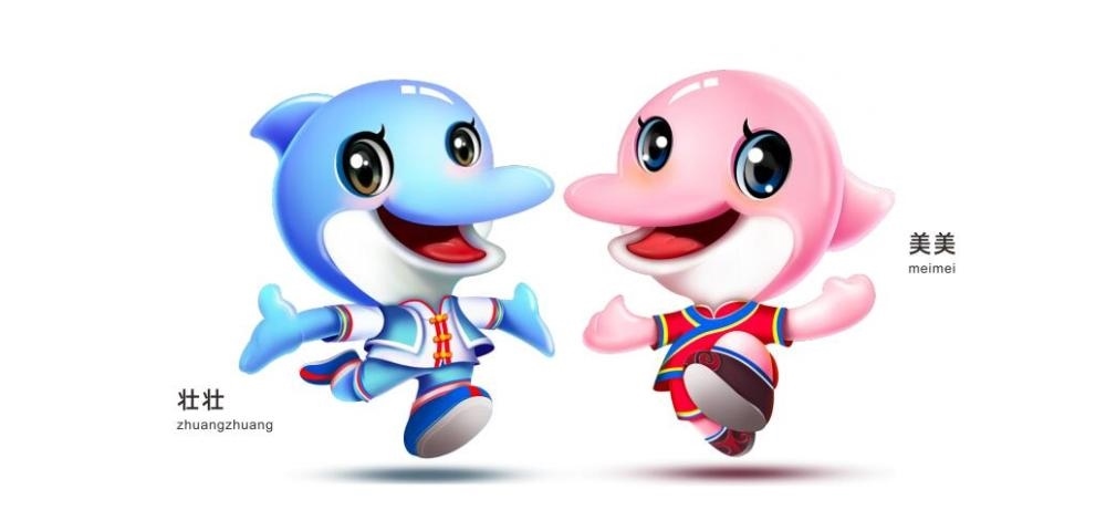 首屆學青會吉祥物“壯壯”“美美”,是一對活潑律動的海豚形象,以中華白海豚為原型創(chuàng)作,搭配壯錦和民族服飾,凸顯廣西的民族特色和地域風格。