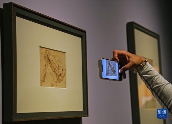 12月10日,觀眾在拍攝展出的米開朗基羅的素描《腿》。