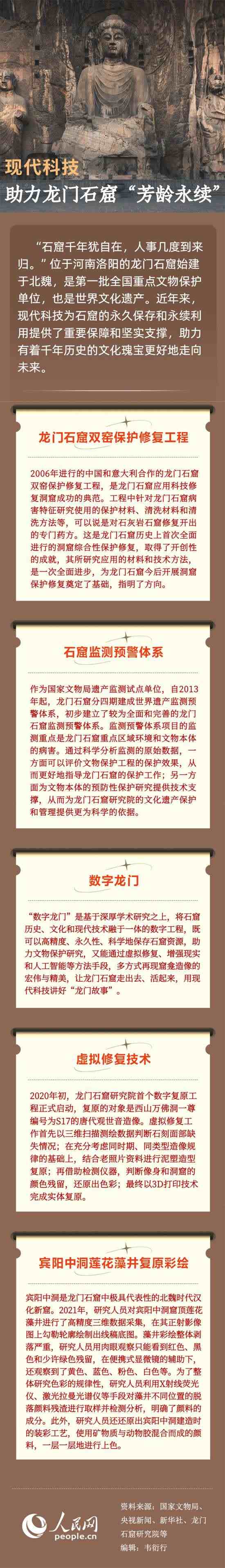 長期以來,不論官方還是民間,龍門石窟的保護修繕工作從未間斷。如今,多種高科技手段已經介入到龍門石窟考古文保工作的方方面面。龍門石窟研究院黨委書記余杰表示,運用互聯(lián)網(wǎng)思維、通過數(shù)字化形式、借助高新科技融合創(chuàng)新,龍門石窟攜帶的豐富多元文化信息,才能更好地走出去、活起來,讓千年石窟盡展時代價值。