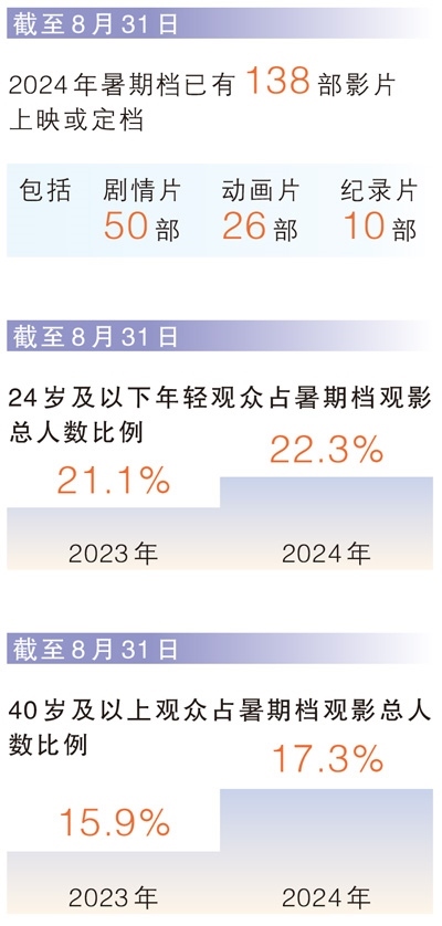 根據(jù)國家電影局統(tǒng)計(jì),2024年中國電影暑期檔(6月1日—8月31日)全國電影票房為116.43億元,觀影人次為2.85億,國產(chǎn)影片票房為84.81億元,占比為72.84%。2024年暑期檔上映、定檔百余部影片,既有國產(chǎn)片也有進(jìn)口片,涵蓋劇情片、動(dòng)畫片、紀(jì)錄片等,題材、類型、樣式、風(fēng)格多樣,開拓了審美空間,力圖滿足不同年齡、不同地域、不同性別觀眾的多樣化觀影需求。