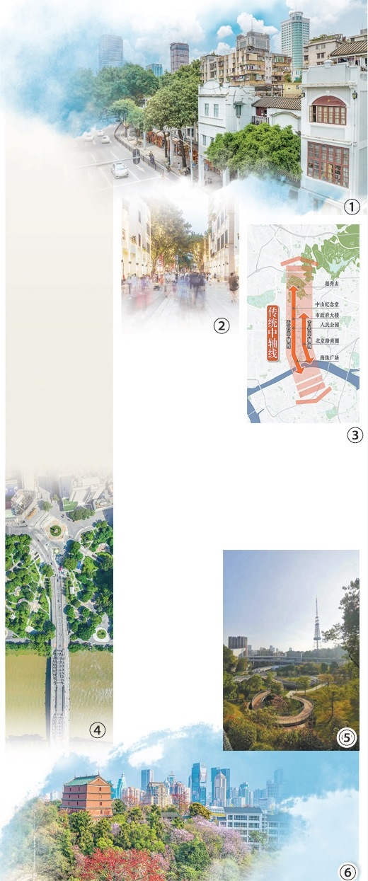 圖①:廣州市越秀區(qū)起義路街景。圖②:廣州市越秀區(qū)北京路步行街。圖③:廣州傳統(tǒng)中軸線示意圖。圖④:廣州市越秀區(qū)海珠廣場(chǎng)鳥(niǎo)瞰圖。黃 劍攝(人民視覺(jué))圖⑤:廣州“云道”越秀山段。圖⑥:廣州市越秀區(qū)越秀山鎮(zhèn)海樓。圖①②③⑤⑥均為廣州市規(guī)劃和自然資源局提供