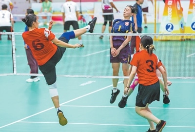 廣東隊選手李思文(左一)在毽球項目比賽中進(jìn)攻。本報記者 厲衍飛攝
